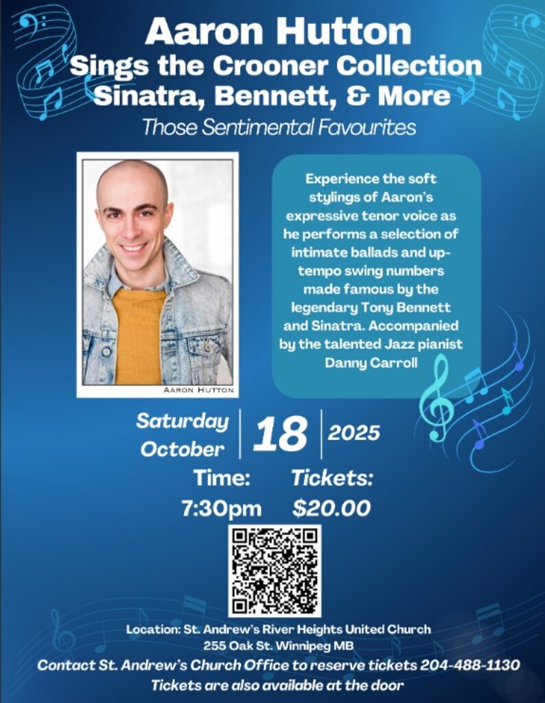 If you enjoy those sentimental favorites by the likes of Tony Bennett, Frank Sinatra and Others of the same era, then this is the concert for you. The concert features the soft stylings of Aaron Hutton, Winnipeg based tenor, well known in the local arts and music community. Aaron will be accompanied by the talented Jazz pianist Danny Carroll.