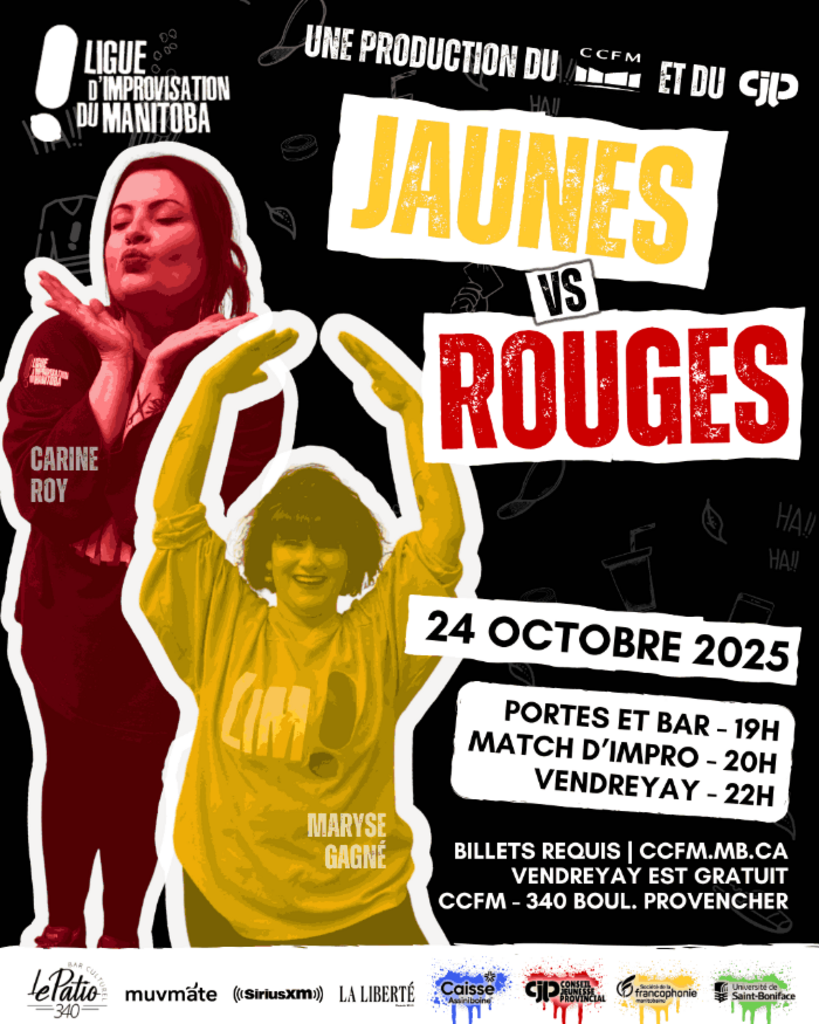 On October 24, at the CCFM in the Antoine-Gaborieau Hall, a new LIM improvisation night will take place. The Yellows and the Reds will be ready to do whatever it takes to win this match! Come witness this battle where their weapons are punchlines and laughter, for an evening full of fun. And that’s not all! After the selection match, the CJP invites you at 10:15 PM for a free Vendreyay packed with games and karaoke, with free admission..