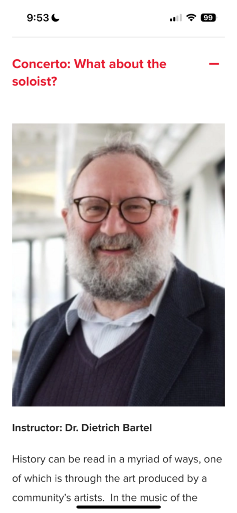 U of W 55 Plus Program presents a six week course on the Concerto, by Dr. D. Bartel. Course starts on November 3 to December 8, every Monday from 1:30-3:30, at the U of W Health and RecPlex multipurpose room. Check out the U of W 55 Plus Program for registration details.
