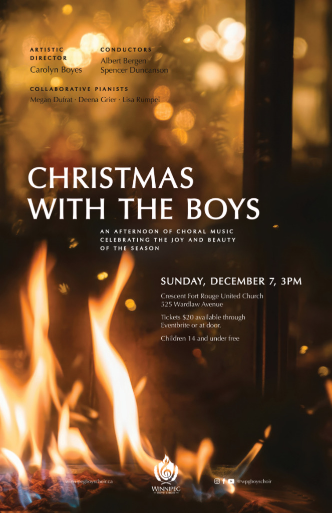 Come have your heart warmed when you join us for a beautiful hour of music featuring the 55-strong Winnipeg Boys' Choir, joined by alumni, in beautiful Crescent Fort Rouge United Church. Tickets are $20; free for kids 14 and under--available on Eventbrite or at the door. Doors open at 2:15. The church is wheelchair accessible. Celebrate our 100th Christmas concert with us!