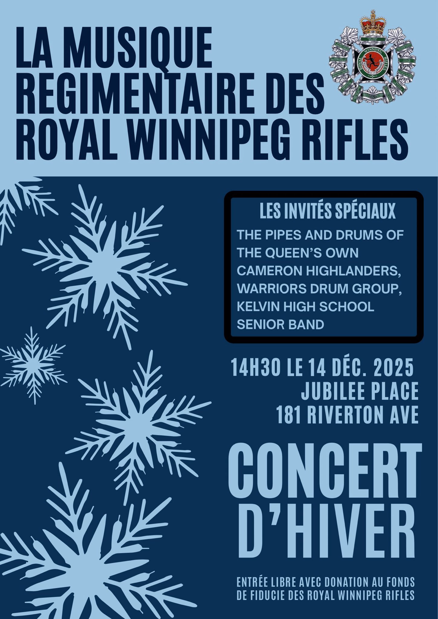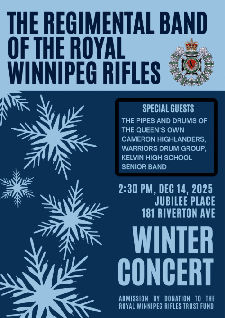 The Regimental Band of the Royal Winnipeg Rifles are hosting their Winter Concert at Jubilee Place. This year's concert will also feature students from Shaftesbury and Kelvin High Schools, The Pipes and Drums of the Queen's Own Cameron Highlanders of Canada, and The Warriors Drum Group of the Royal Winnipeg Rifles.