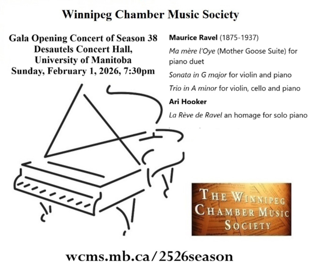 Tickets (Adult $40, under 25 $15), season subscriptions, free parking map and donation link are online now at http://wcms.mb.ca/2526season.html