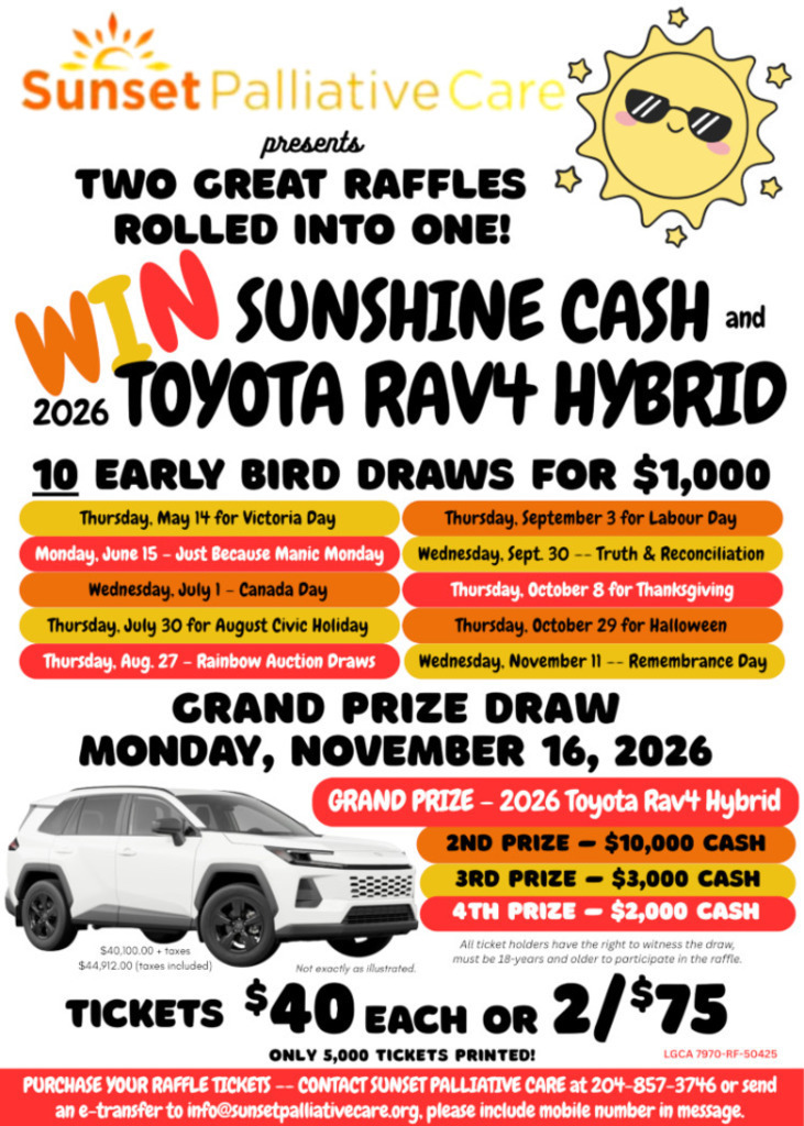 Sunset Palliative Care has combined their Sunshine Cash Raffle and SUV Raffle into one mega raffle where you could win OVER $69,000 in cash and prizes.