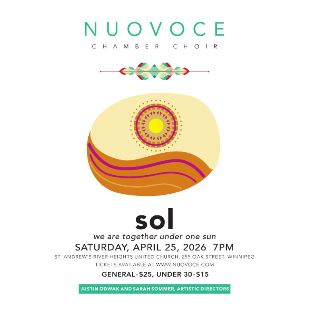 NUOVOCE Chamber Choir is thrilled to invite you to their spring concert, Sol, to be held at the beautiful St. Andrews River Heights United Church in Winnipeg on April 25, 2026 at 7:00 pm.