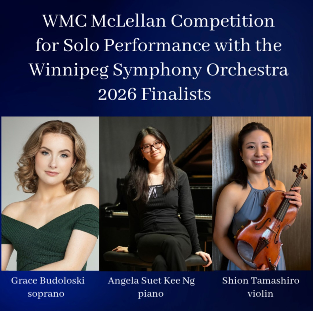 The Women's Musical Club of Winnipeg invites you to the 11th biennial WMC McLellan Competition for Solo Performance with the Winnipeg Symphony Orchestra. This is Manitoba’s only musical competition in which finalists perform with full orchestra. This year's performers were selected by a three-member jury following the Semi Finals in February.