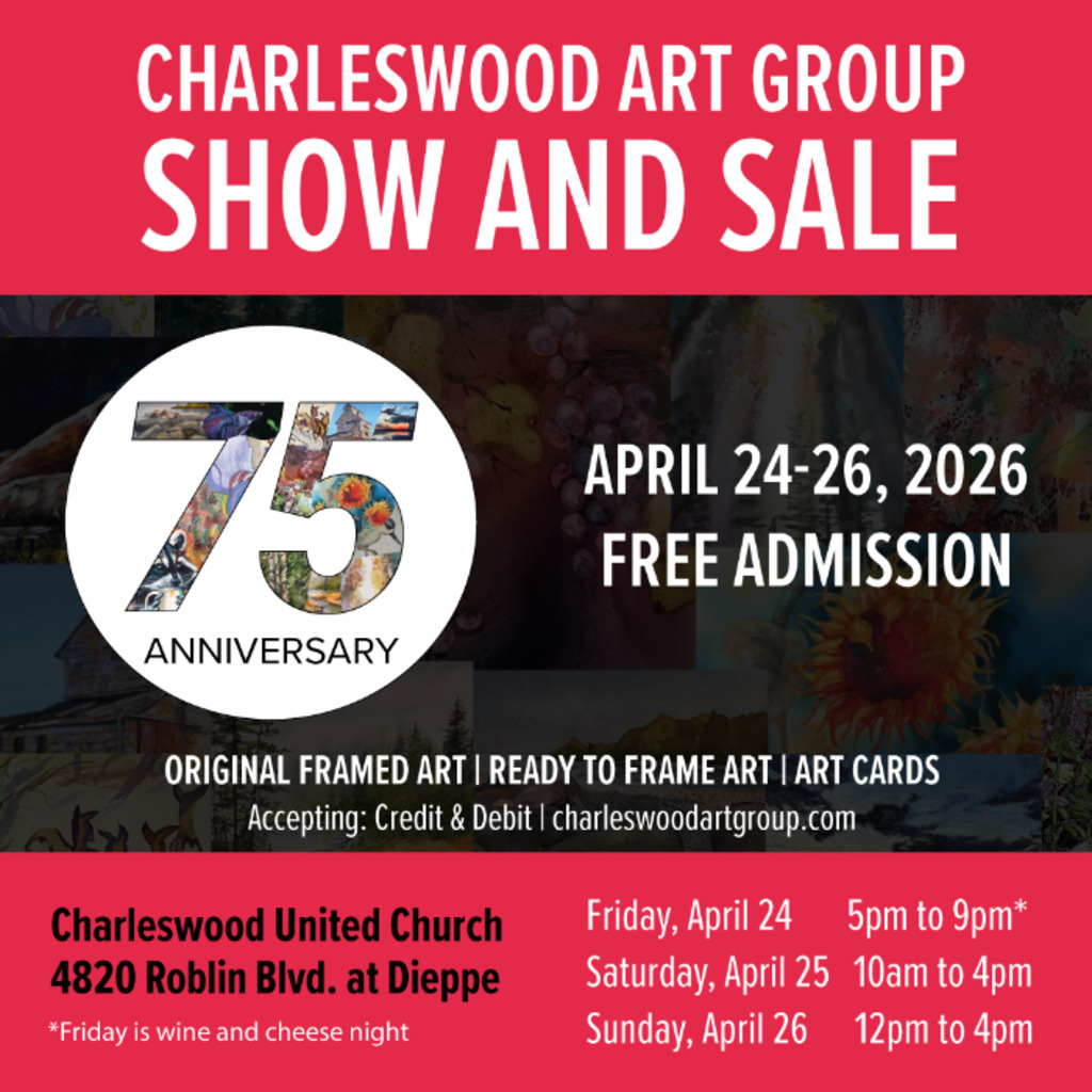 The Charleswood Art Group would like to invite Winnipeg to join us in celebrating our 75th anniversary at our annual Art Show and Sale. We have 45 members participating in the show this year with a wide variety of pieces of original framed and ready-to-frame fine art along with prints and art cards all available for sale. We kick off the weekend with a Wine and Cheese evening which is a great chance to meet and greet the artists in a festive environment. Each year we have an art auction to recognize the value of art in all areas of our lives. 100% of the proceeds from the Art Raffle goes to the CancerCare Art Therapy Program. Another way we give back to the community.